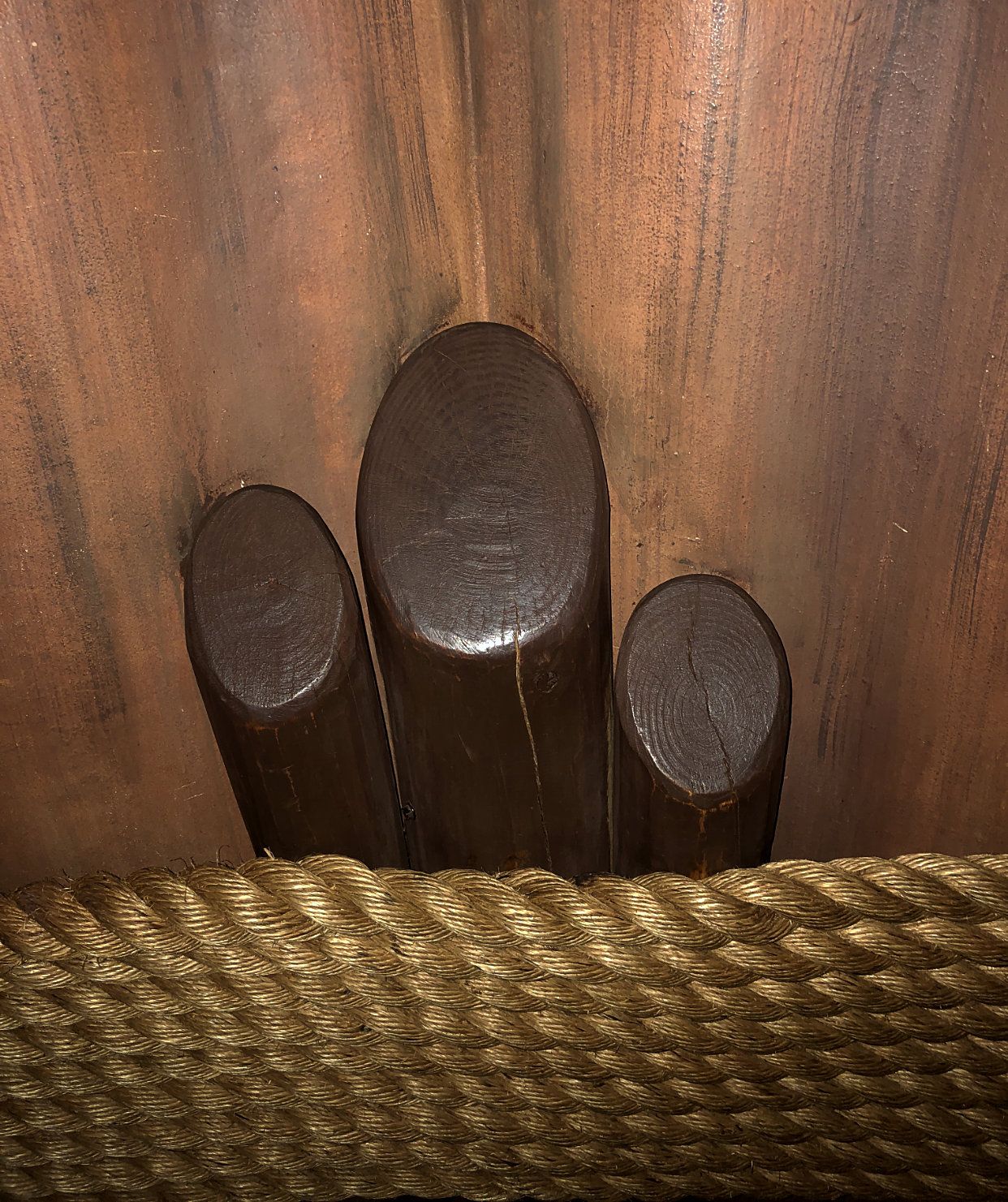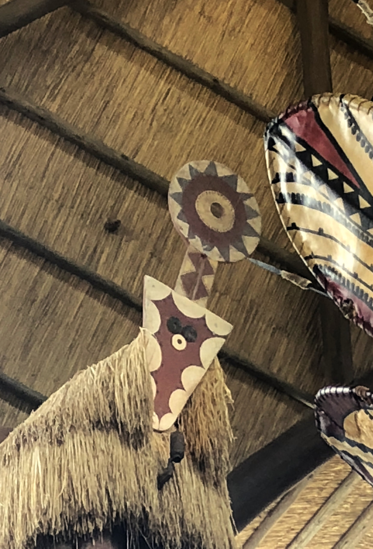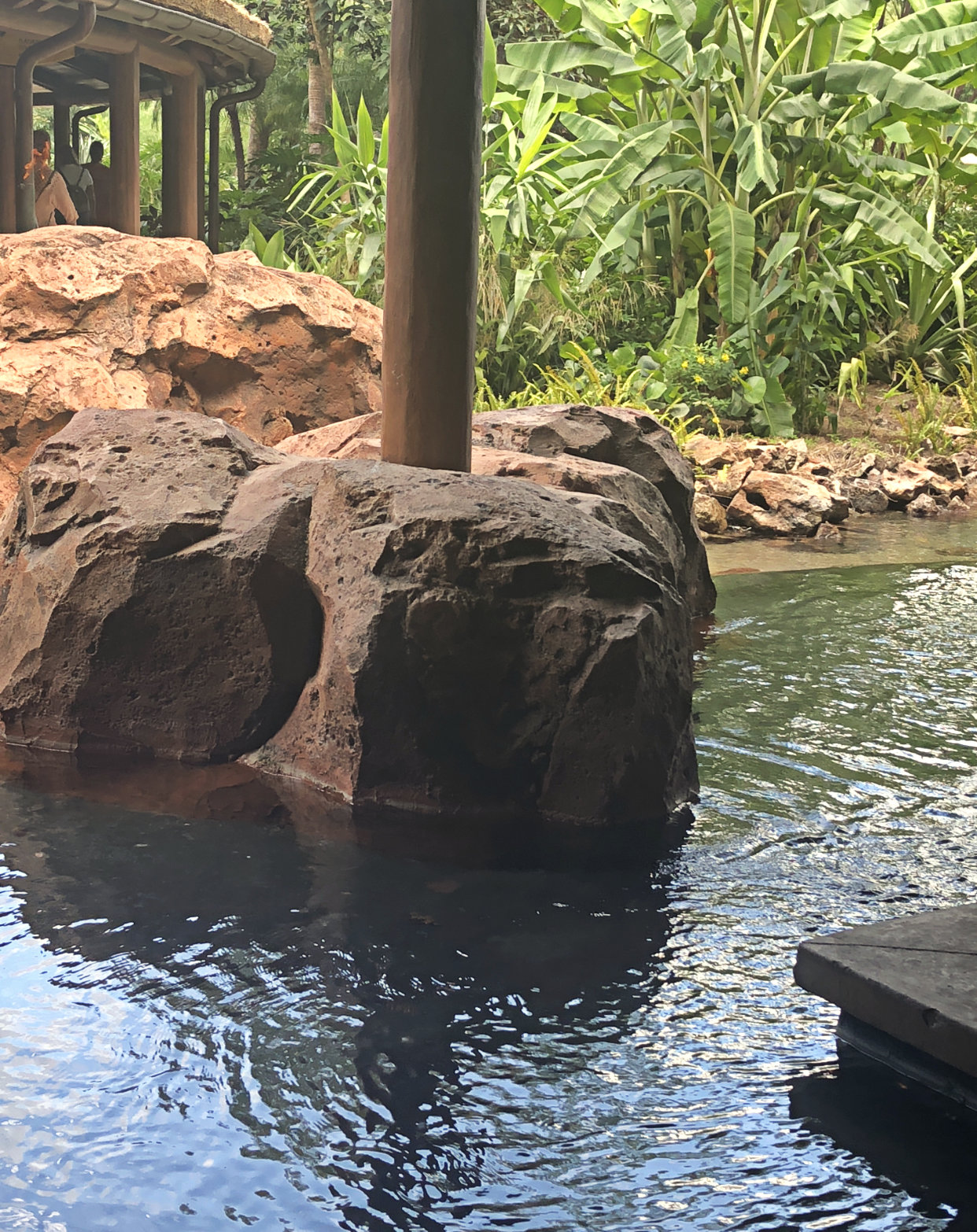 I walked back up the stairs to the grand main lobby of the Animal Kingdom Lodge Jambo House. This lobby is incredible with its beautiful architecture and the windows on the far end that look out towards the savannah. Inside the lobby, on either side of you, there are giant columns, which if you take a close look at you will notice there are logs tied together that create a Hidden Mickey. Now look up towards the ceiling, at the top of these pillars are African-themed shields with three circles that create another Hidden Mickey. Admittedly, looking back at the book, the Hidden Mickey it references is made up of three black circles and the one I photographed has two black and one yellow circle. Hopefully this still counts! The last stop in the lobby is back down the staircase headed for Boma, but stop on the landing to gaze at the waterfall. In the rock work there is another Real Tuffy Hidden Mickey.