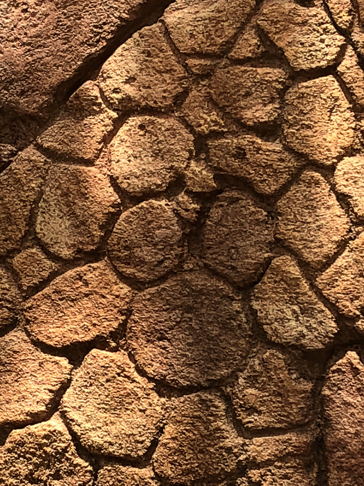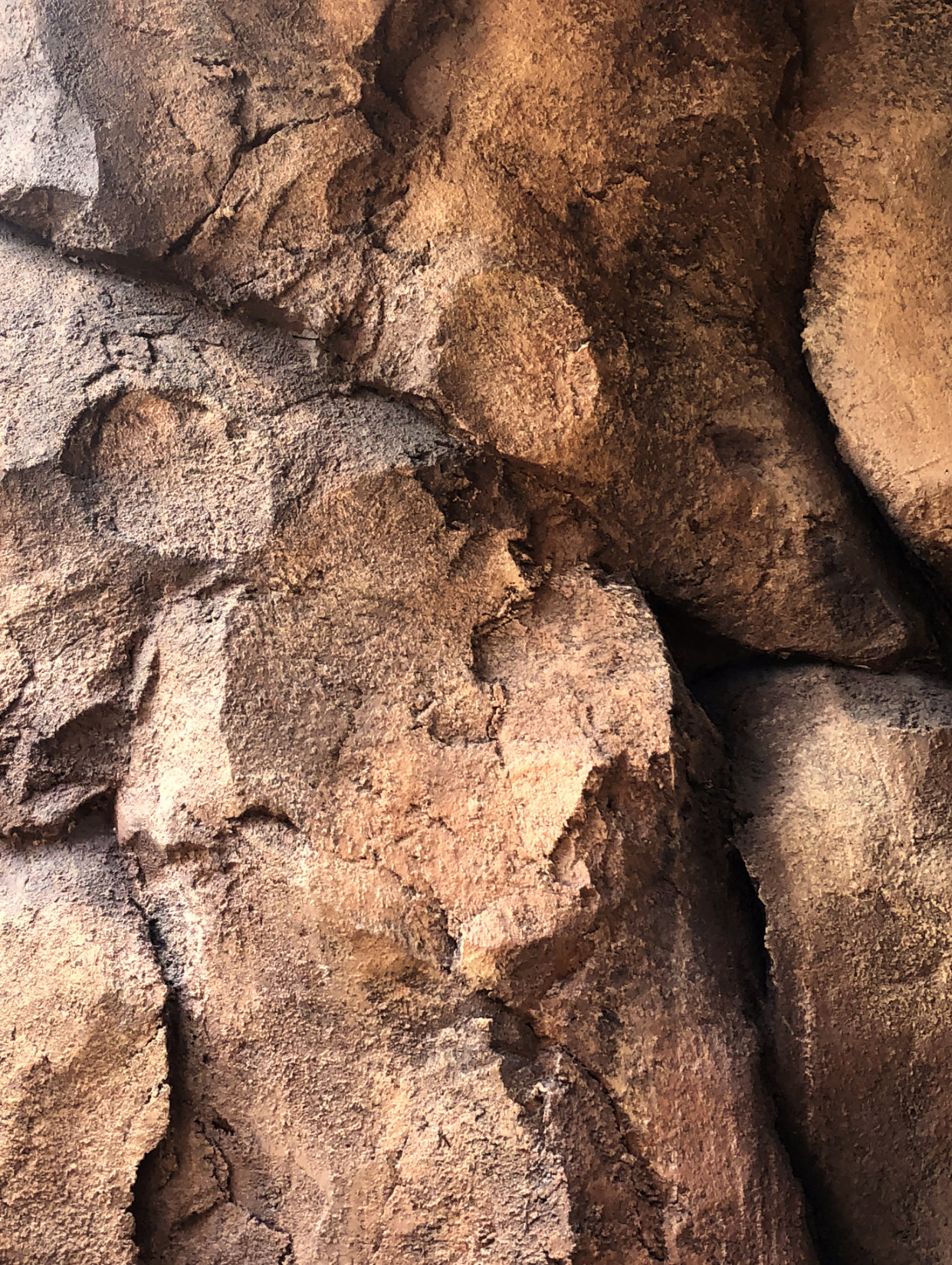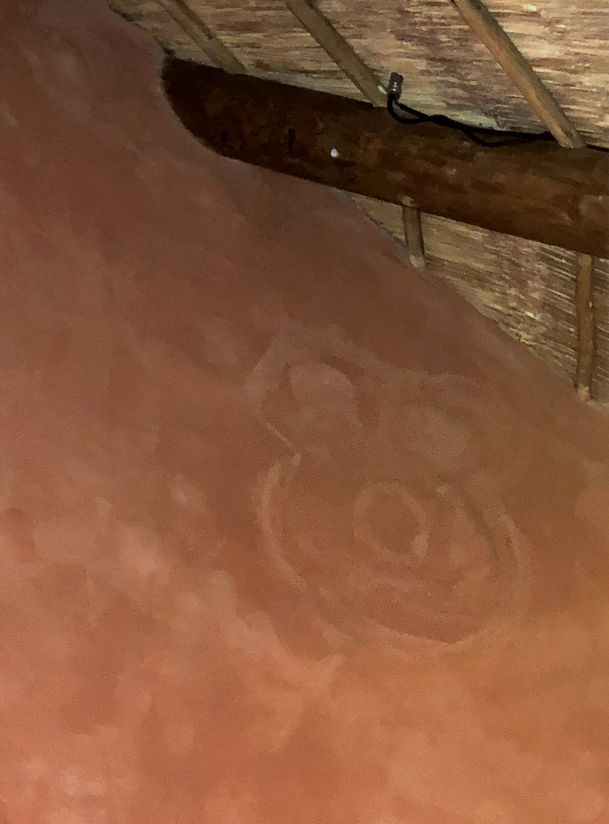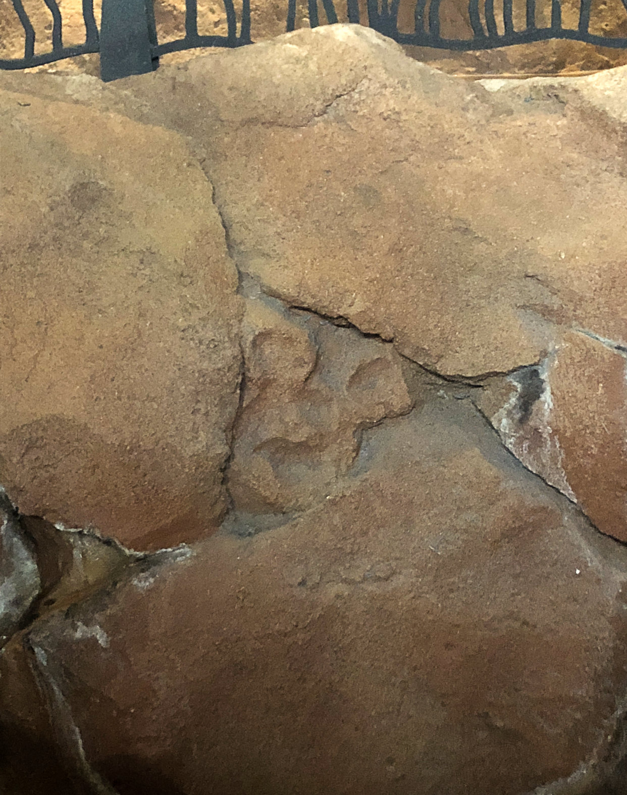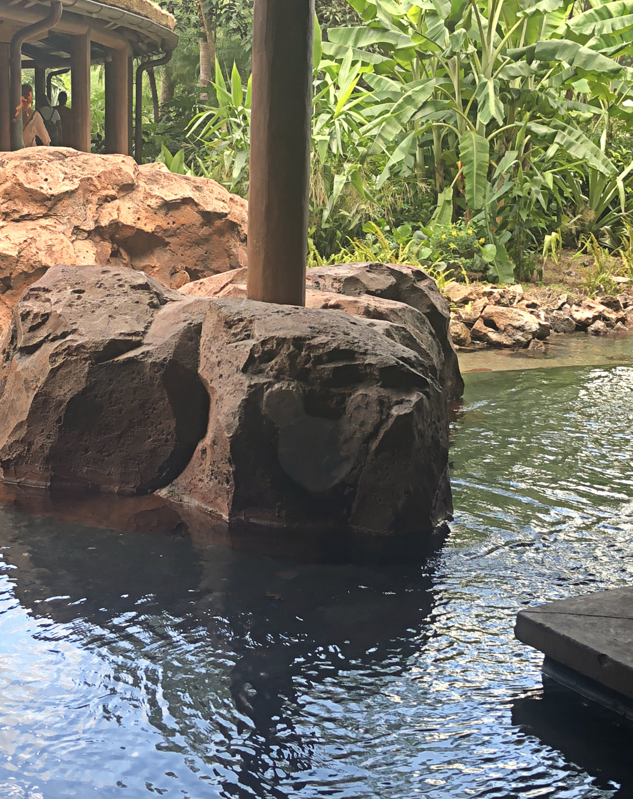 The last spot before I moved over to Kidani Village, which is the Disney Vacation Club villa section of Animal Kingdom Lodge, is the viewing area over the savannah. This is probably the most unique part of the Animal Kingdom Lodge, that you can wake up to see animals right outside your window grazing on the savannah. Once you head outside of the lobby, turn around and look up at the vine-inspired columns. On the left-hand side you will find the last Real Tuffy. This is a tricky Hidden Mickey because it is not a classic three circle silhouette to represent Mickey. I definitely needed help from a Cast Member to spot this Mickey. Then turn back around and walk out towards the viewing area. On the left hand side in the rock work you will see a giraffe and her calf. Three spots on the mother giraffe form our next Hidden Mickey. Last, but not least, go further into the viewing area you will find one more example of Mickey’s head imprinted into rock work.