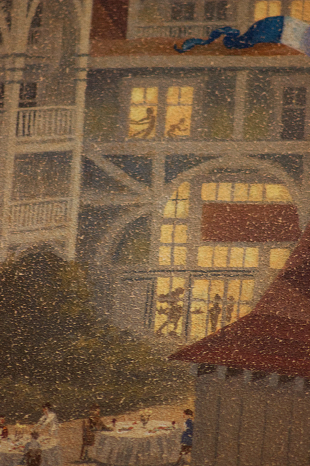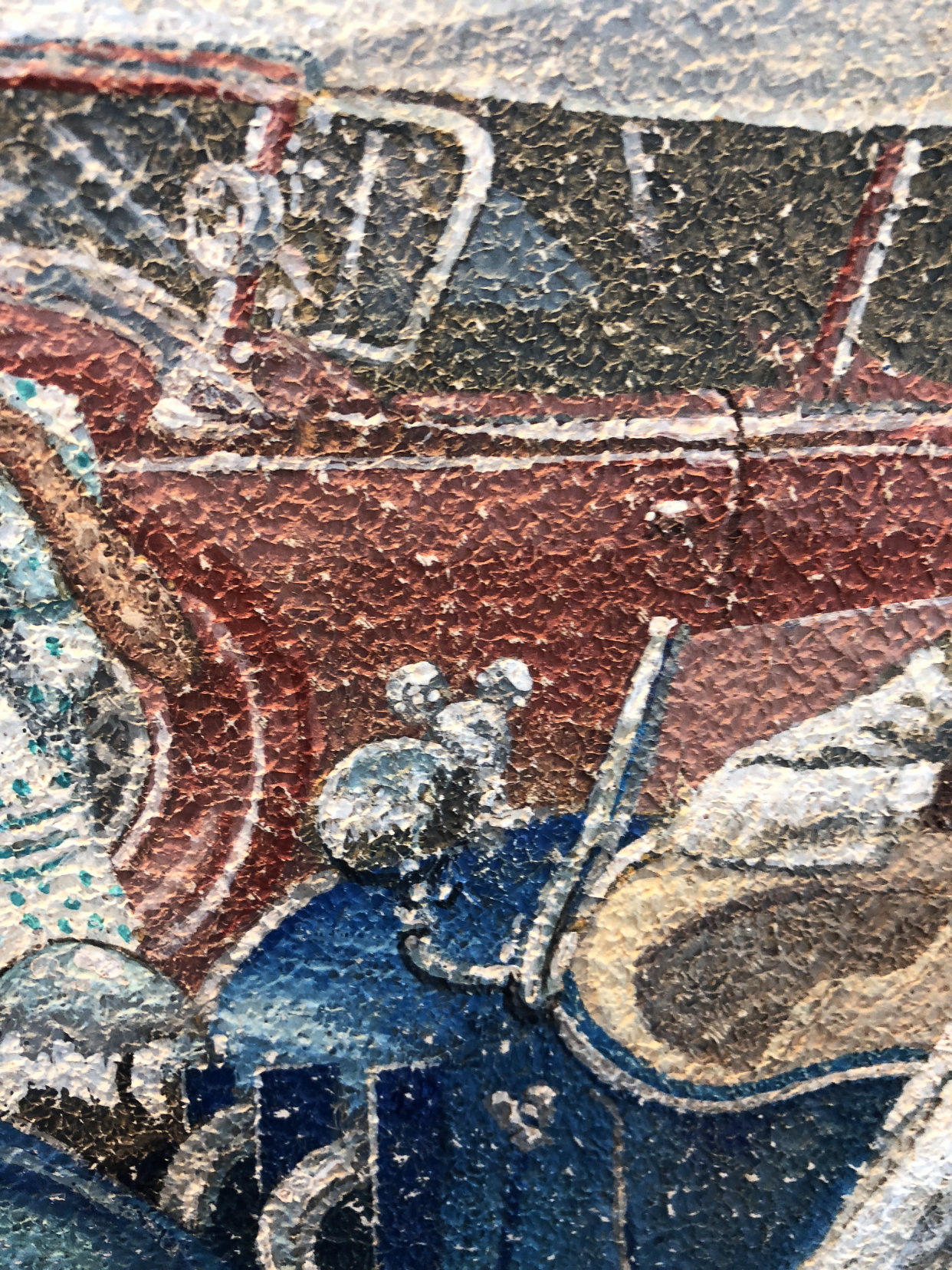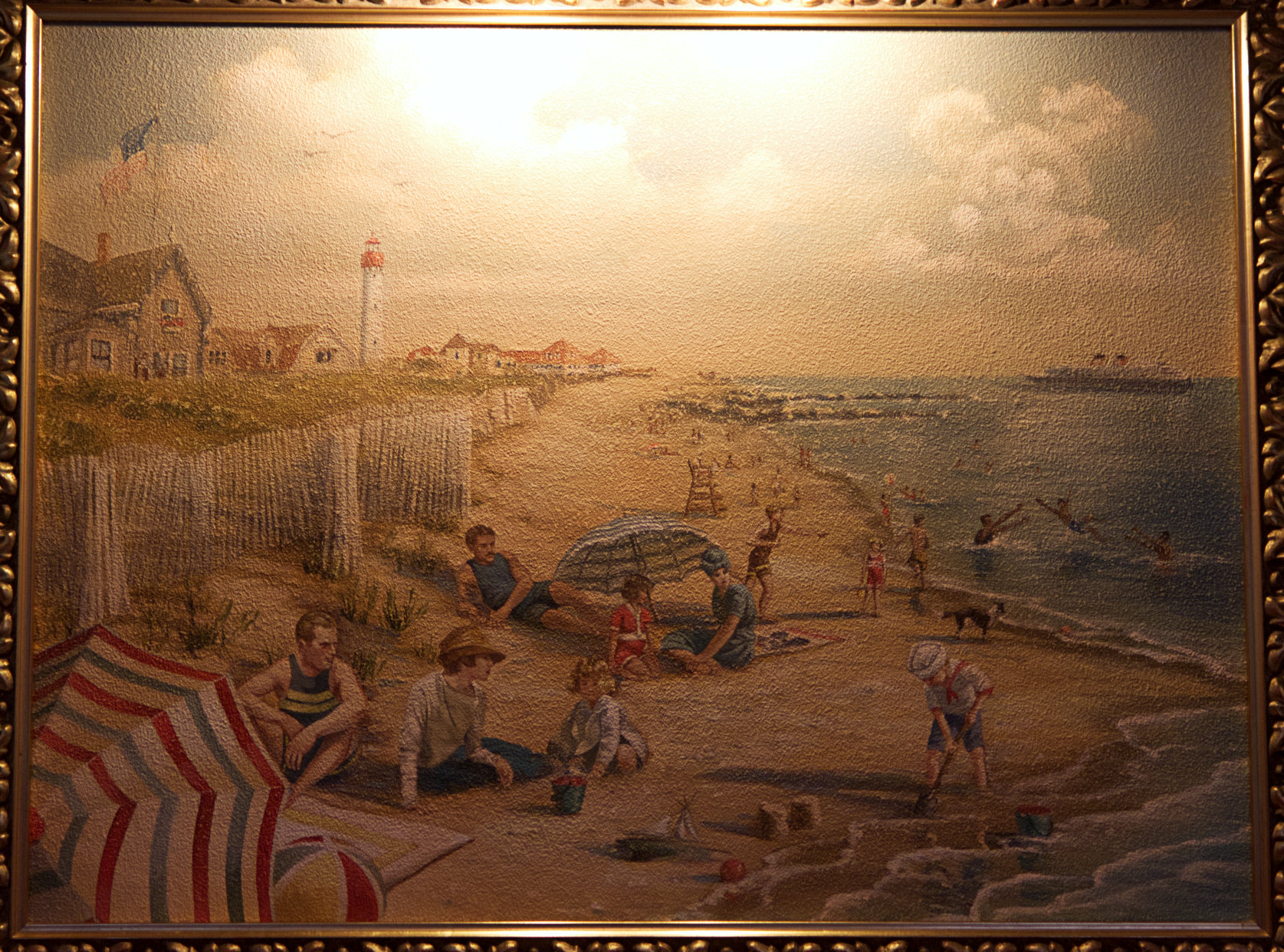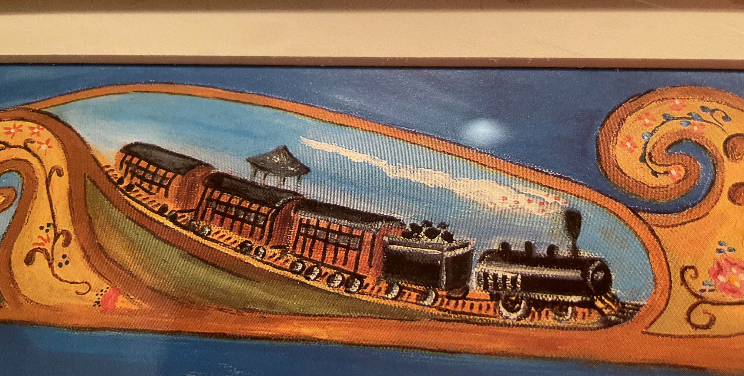 I walked towards the bathrooms to find the next Hidden Mickey. Located in another paining, there is a steam engine. In the coal car , there are three pieces that form a classic Hidden Mickey. This is a wonderful homage to Walt Disney and his love for trains. The book considers this one to be A Real Tuffy, I did not find this one to be too difficult, but it is tiny.