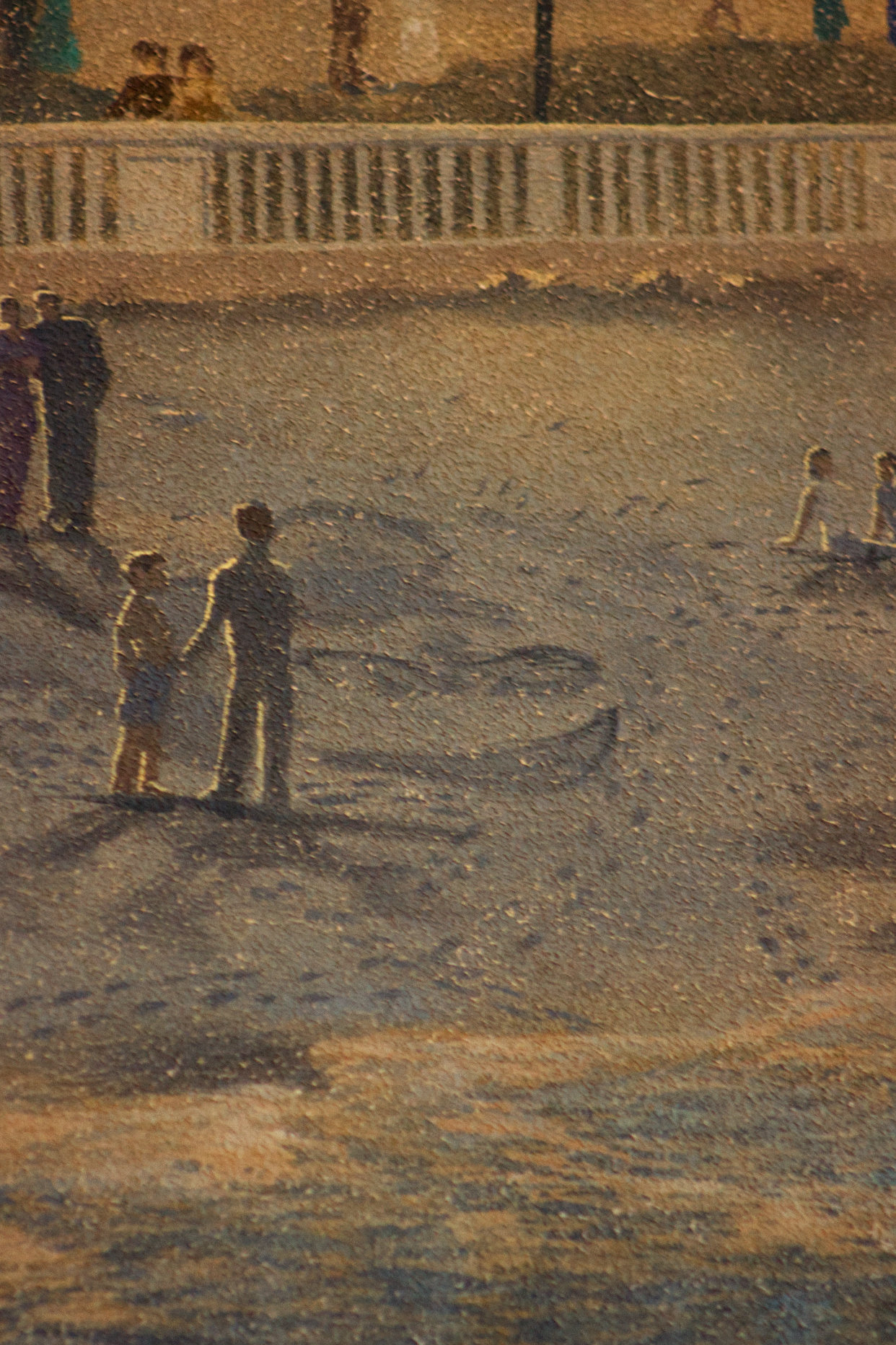 Mickey can be found floating in the sky and in the railing pattern. Looking at the window of the building, which I believe is reminiscent of the exterior of the Yacht & Beach Club, Mickey can be seen waving. This is not officially in the book, but I thought it was worth pointing out because it is a unique Hidden Mickey, as it is a full body shadow of Mickey. I imagined Mickey is doing a meet and greet inside of the hotel. The last one in this mural, that is mentioned in the book, is questionable in my opinion. Mickey is supposed to be found in the sand. I needed to watch Hidden Mickey Guy’s video in order to locate it. I’m not sure if Mickey has been washed away by some waves, but I did not really see it. What do you think?