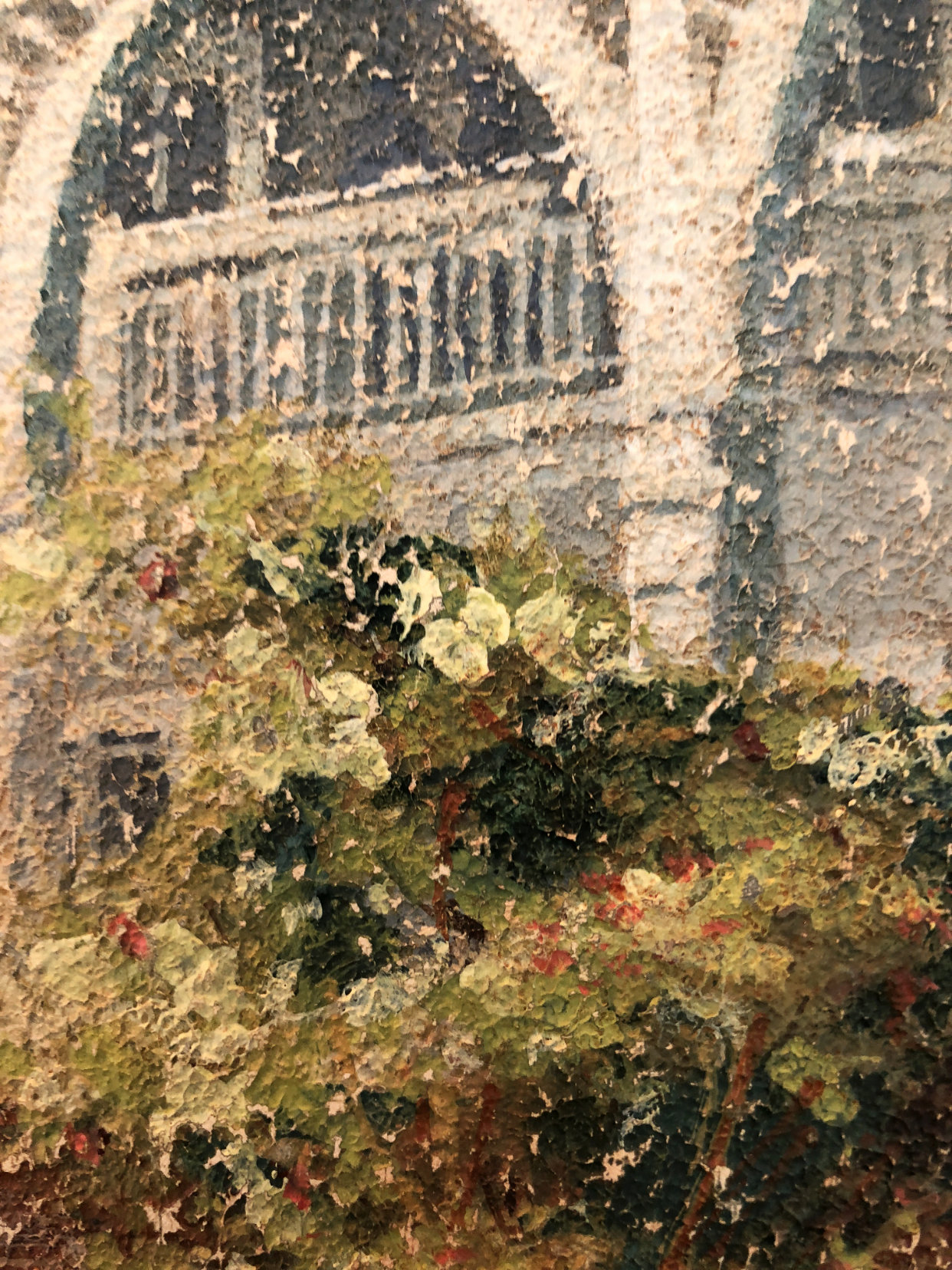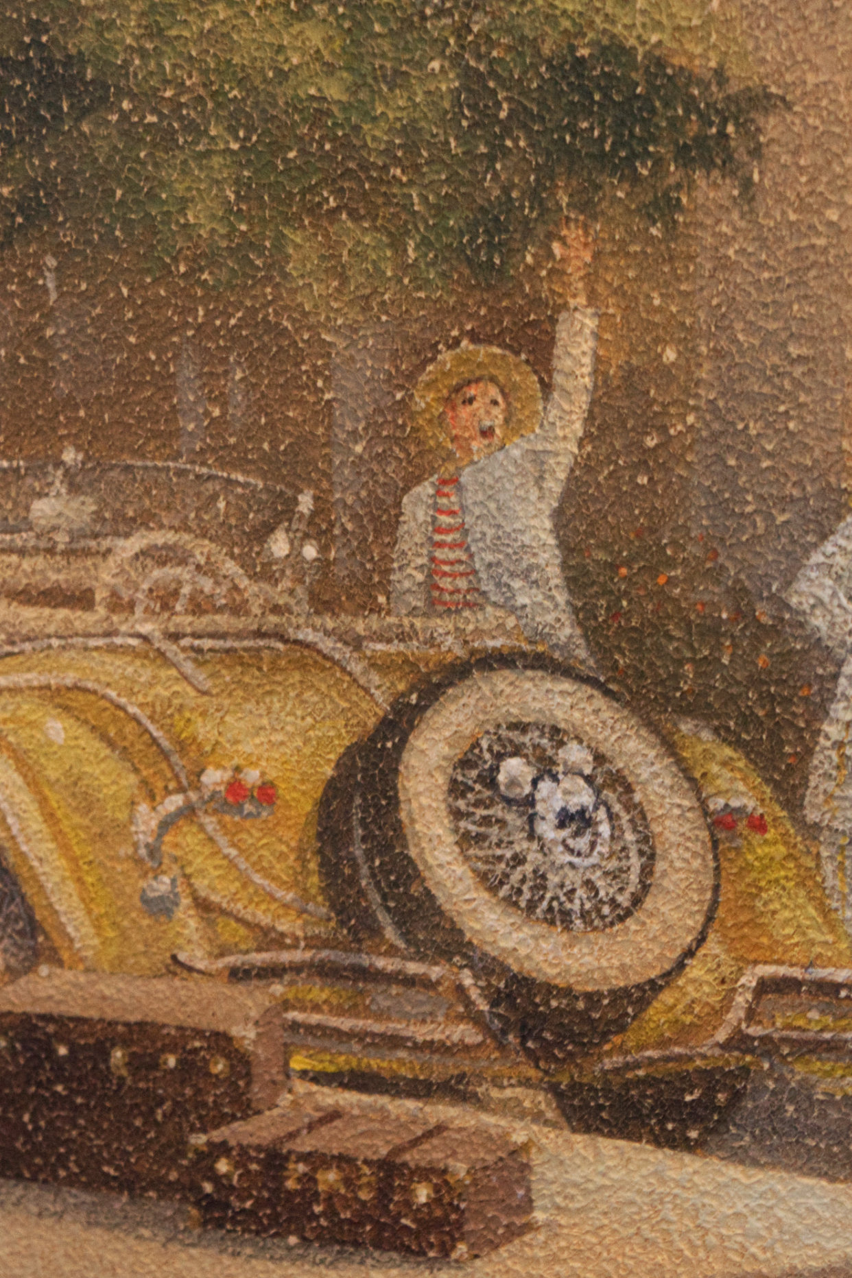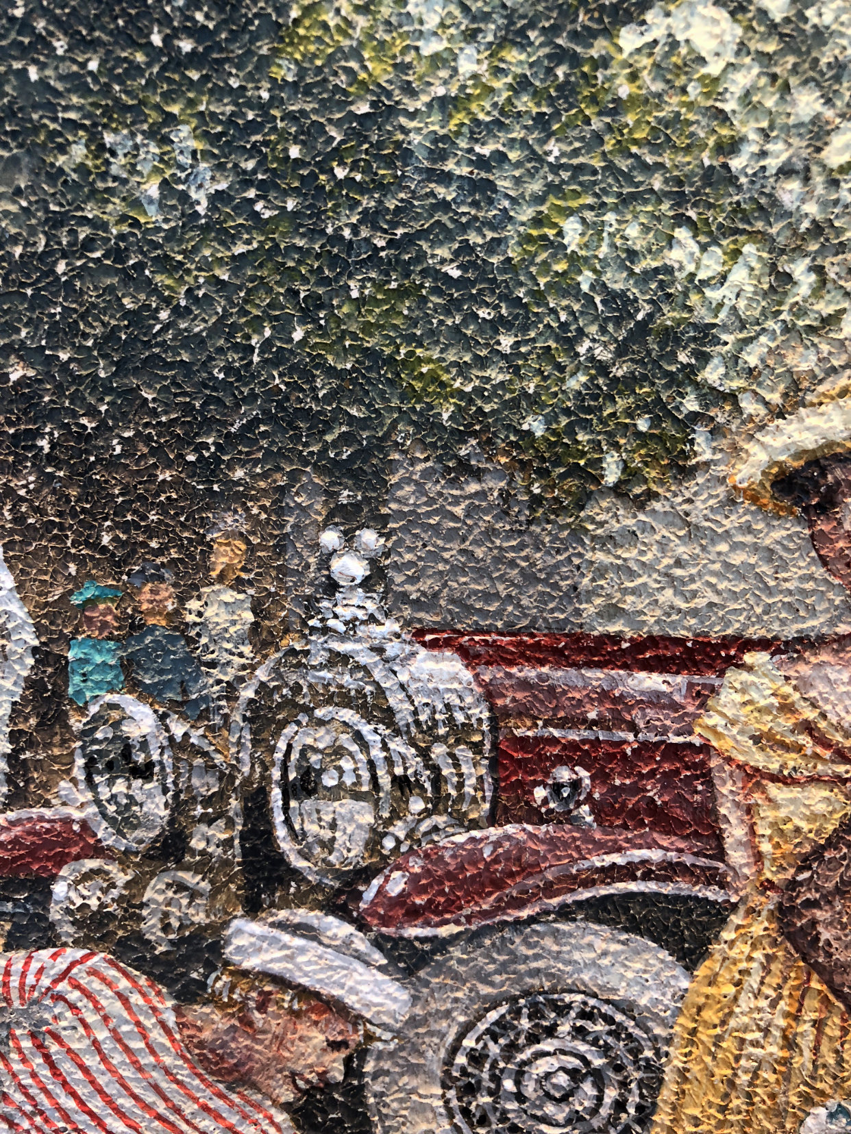 The Solarium is my favorite part of the Beach Club to visit. It is located between the resort lobby and the villas. While I was on the hunt for Hidden Mickeys, I spoke with some Cast Members at the Beach Club Marketplace. They recommended that I check out the Solarium for Hidden Mickeys, and they are not wrong! There are three paintings on the wall that are chock-full of Hidden Mickeys. Mickey can be found on Mickey-themed balloons, spare tires, car hood ornaments, the funnel stack of a Disney ship, a beach towel, a cloud, a tree, and a building.