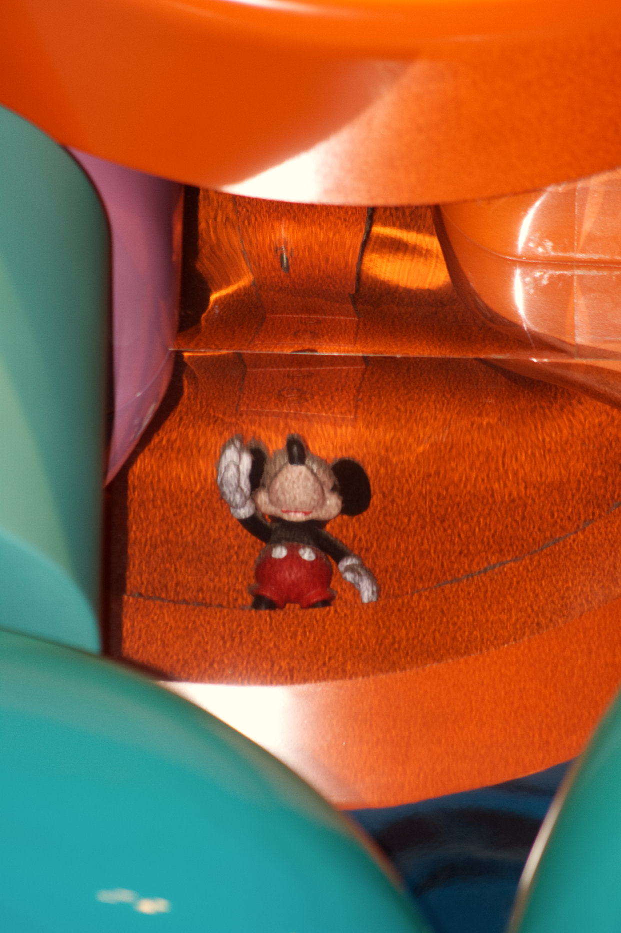 Mickey can also be found hiding at the Ink & Paint Shop in Animation Hall. In my opinion, this should be considered a Real Tuffy. Not only is this one difficult to locate, it is also very difficult to capture. Behind one of the check-out counters there is a sign that says: “Package Pick-up.” Under the sign, look up and you can find Mickey hiding up there.