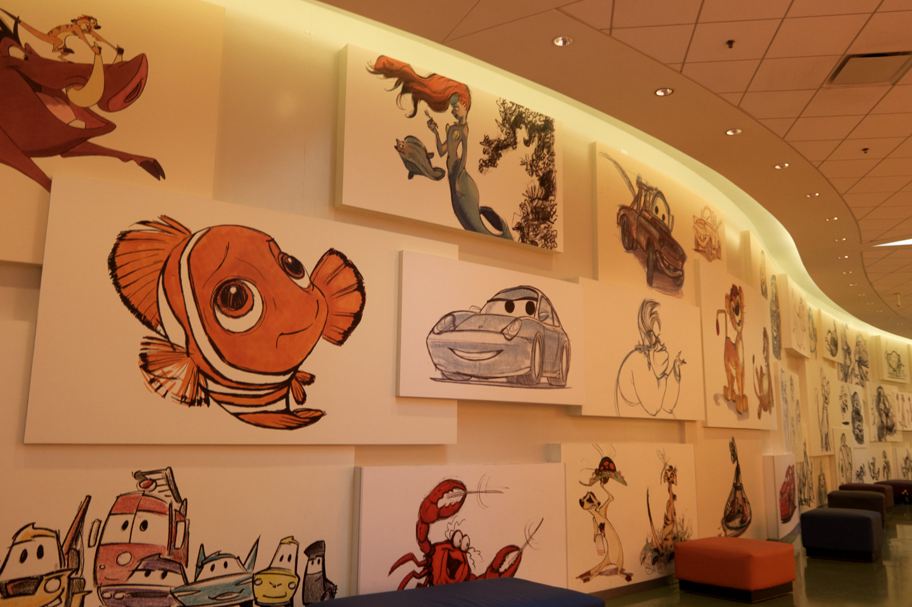 Landscapes of Flavors is the quick service location at Art of Animation. This dining option is considered the best quick service at a value resort because of the variety of food available. The dining room parallels the décor of the rest of the resort as there are four different sections: Lion King, Little Mermaid, Finding Nemo, and Cars. First, I went into the Lion King section and gazed up at the light cover which features a beautiful mural. On one of the tress, there is moss that forms a Hidden Mickey. I remember when I first found this Hidden Mickey three years ago, I struggled to locate it and needed assistance from a Cast member. The second time around, I was able to locate it much quicker.