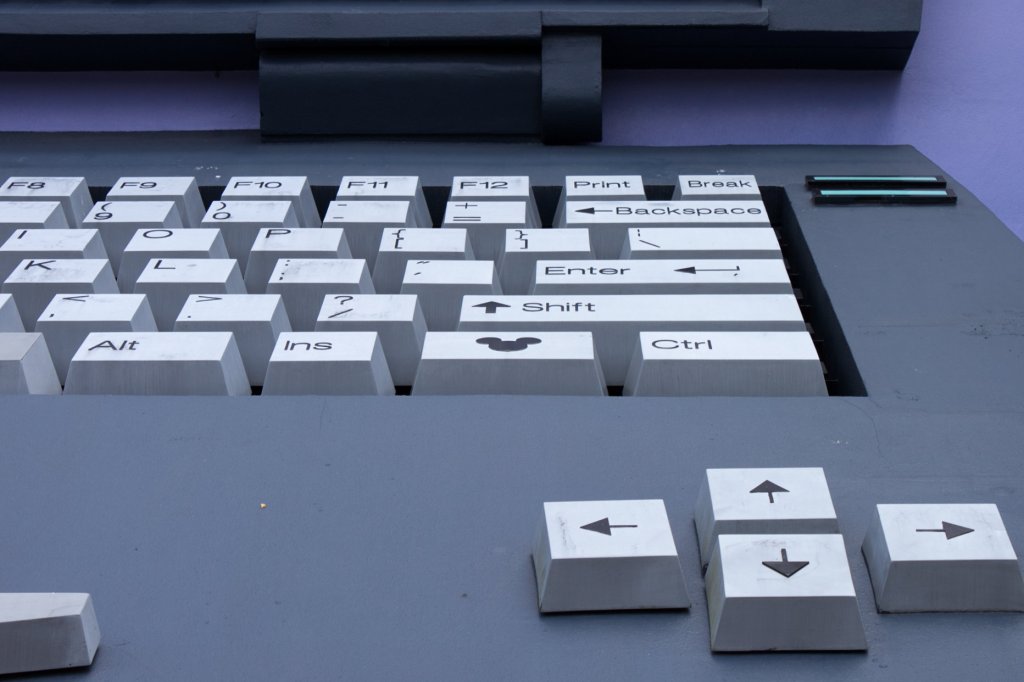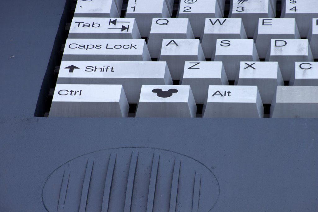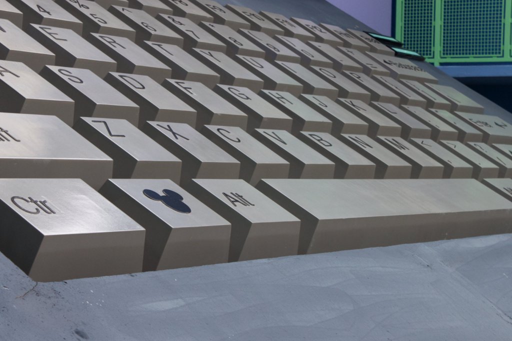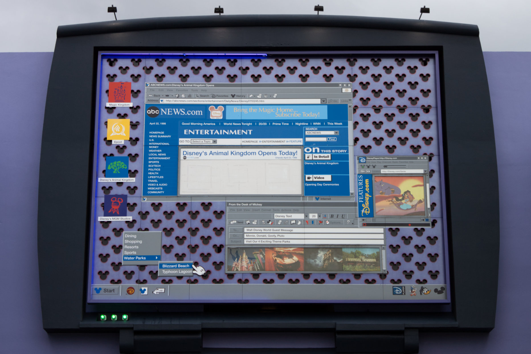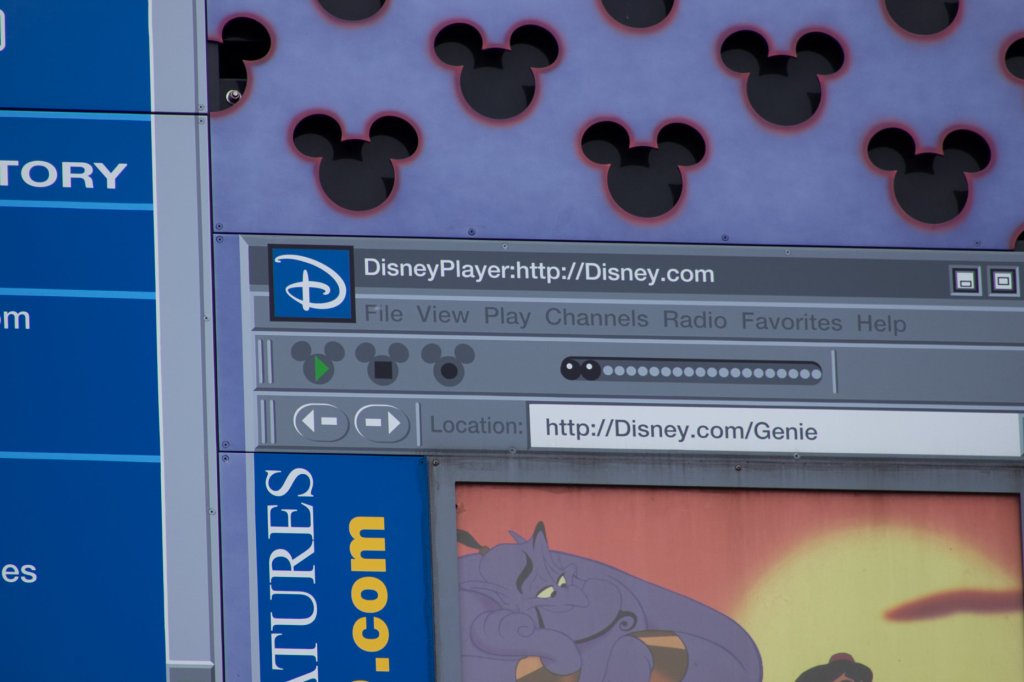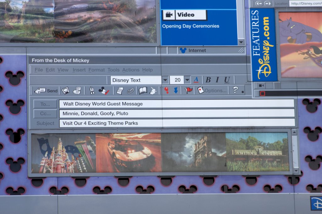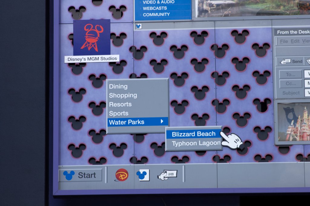 Continuing on to the 1980s section, there are a plethora of Hidden Mickeys to be found here. By the computer pool, there is a laptop which serves as the icon for this building. On the screen and on the keyboard are the obvious Hidden Mickeys, but do take the time and look at all of the detail that is included on the screen. From the website tabs, email, and even shortcut icons this large symbol shows a lot of Disney history from that time period. Some important details I noticed include a message that Mickey is sending as an email to guests and CCing the rest of the Fab Five. In this email is a picture of the castle as its 25th anniversary cake version. There is also a shortcut icon on the desktop for MGM Studios, know known as Hollywood Studios. There is also a drop down selection showing Disney’s water parks at the time, which is actually not accurate because in the 90s River Country, Disney’s first water park, was still open.