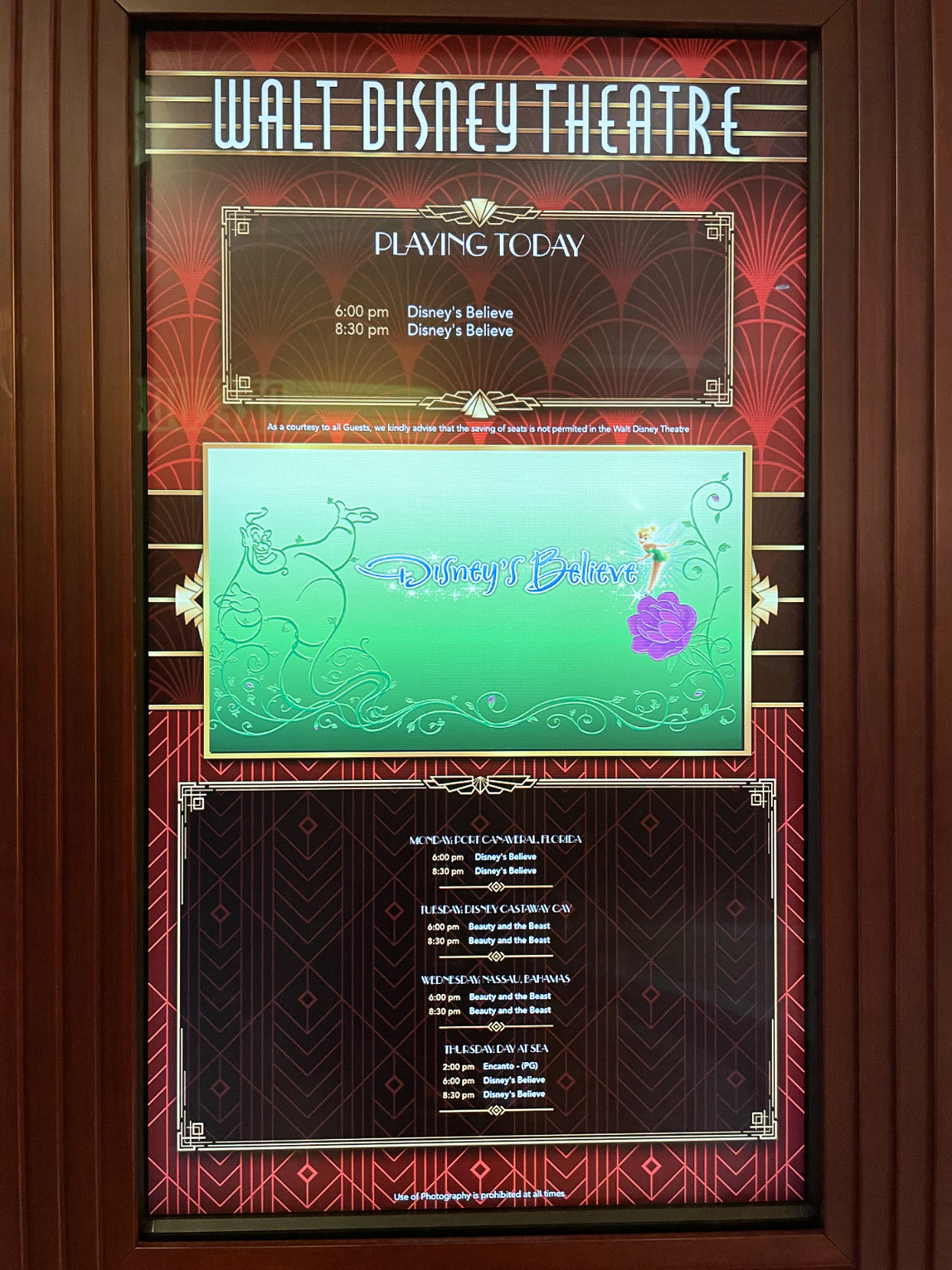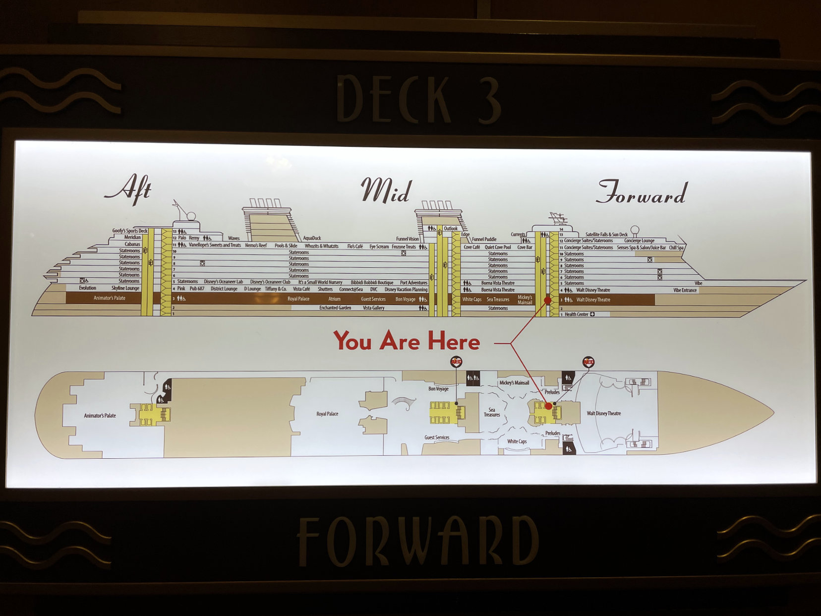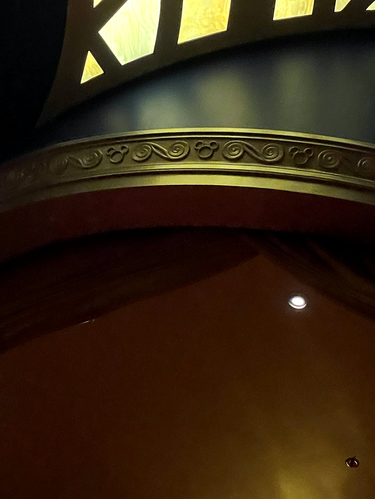 There are two dining times and because we had the later one, we went to the earlier show. The show on the first night was called Believe. Rather than having a different show each night, because the seating was physically distant, they did the two shows, Believe and Beauty and the Beast, two times while we were aboard. This show was absolutely amazing and definitely worth watching. I loved how they incorporated Disney songs throughout the entire show. I’m not saying it was a tear-jerker, but I may have shed a few tears. While we waited for the show to start, I also found some Hidden Mickeys inside the theatre.