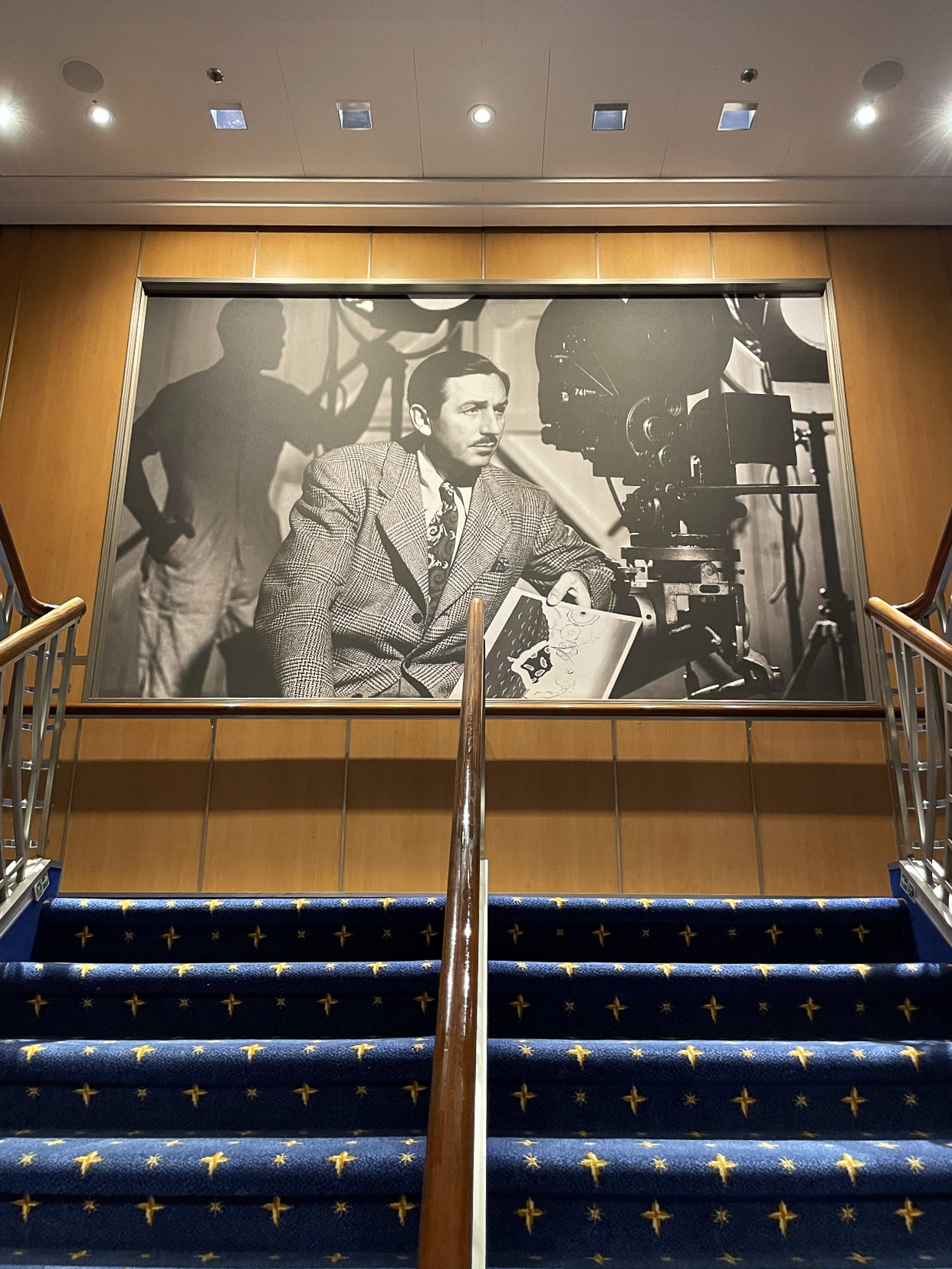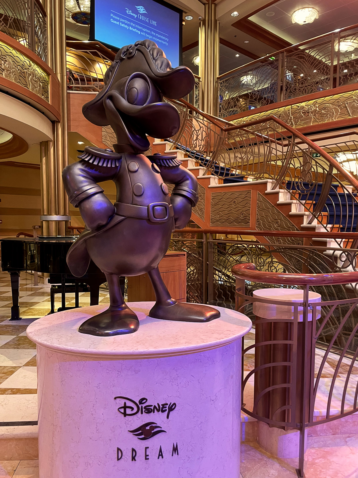 We then explored the atrium, went into the shops, started the Midship Detective Agency mystery game, and played with the steering wheel from the Jolly Roger on deck 5. We also took some photos of Admiral Donald, a bronze statue of Donald in the atrium. We walked around the Promenade for a bit and then headed back to the room to unpack as we sailed away.