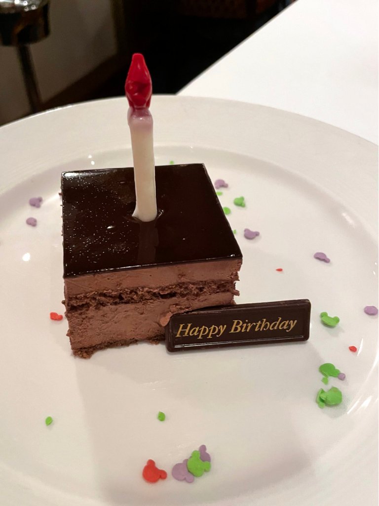 We were even visited by some princesses during our dinner. We had a special surprise at our table when it came time for dessert. Our wait staff came to sing Happy Birthday to me and present me with dessert which was so kind of them; however, it was not birthday. It was in fact four months after my birthday. Our table came up with many theories about what happened and we decided that maybe they just wanted to create some extra magic for our table.
